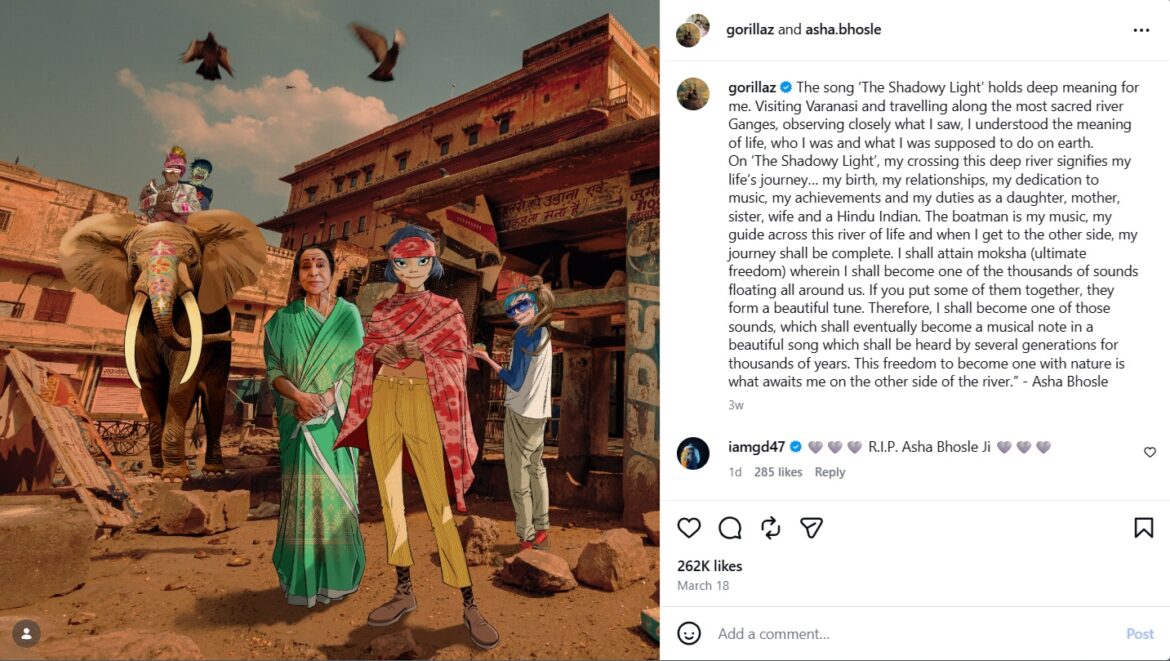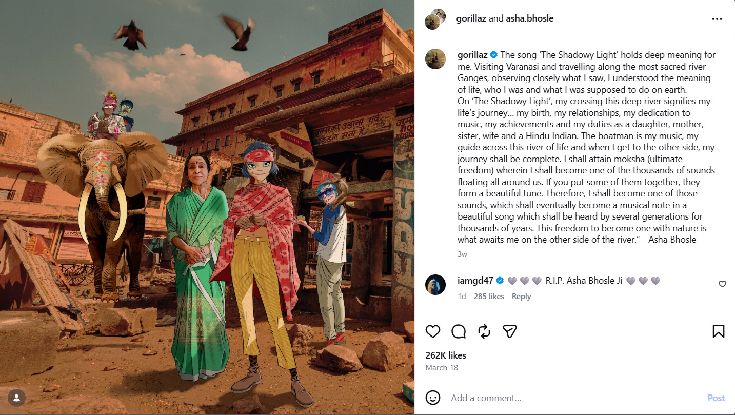 And the final cherry on the cake was her last-ever recording. Not for her a devotional or a film song like most others, but the track, A shadowy light from the British English virtual band, Gorillaz. Released this February, the song was created by musician Damon Albarn and artist Jamie Hewlet in their ninth studio album, Mountain (Parvat). Asha opened the song with the lines, Chal gehre paani mein naiyya utaar, sharing vocal credits with Gorillaz and Gruff Rhys.