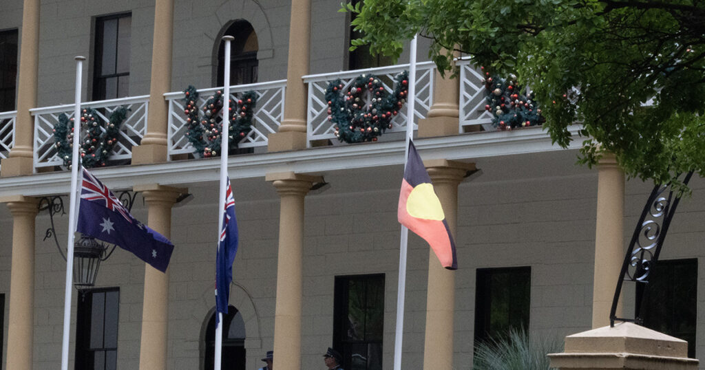 Flags at NSW Parliament House fly at half-mast to honor the lives lost and those injured in the Bondi Terror attack, Dec 15, 2025. PHOTO: X@nswparliament