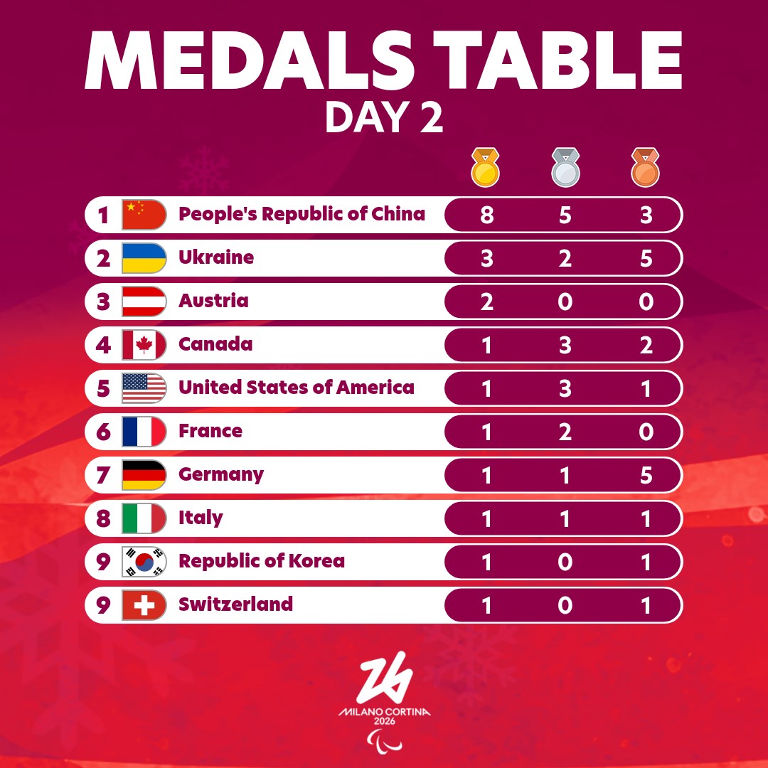 China surged to the top of the medal standings at the Milano Cortina Winter Paralympics on Sunday, increasing its tally to 16 medals, including eight gold. Canada also celebrated a milestone moment as Natalie Wilkie captured the country’s first gold medal of the Games.
