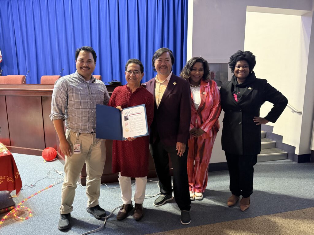 Robert D., Chief of Staff for the Mayor’s Office of Community Affairs, presented the proclamation on behalf of Director Lamont Carey to Rajiv Paul of Radio Zindagi, joined by De Guzman and Commissioners Scott and Snyder.