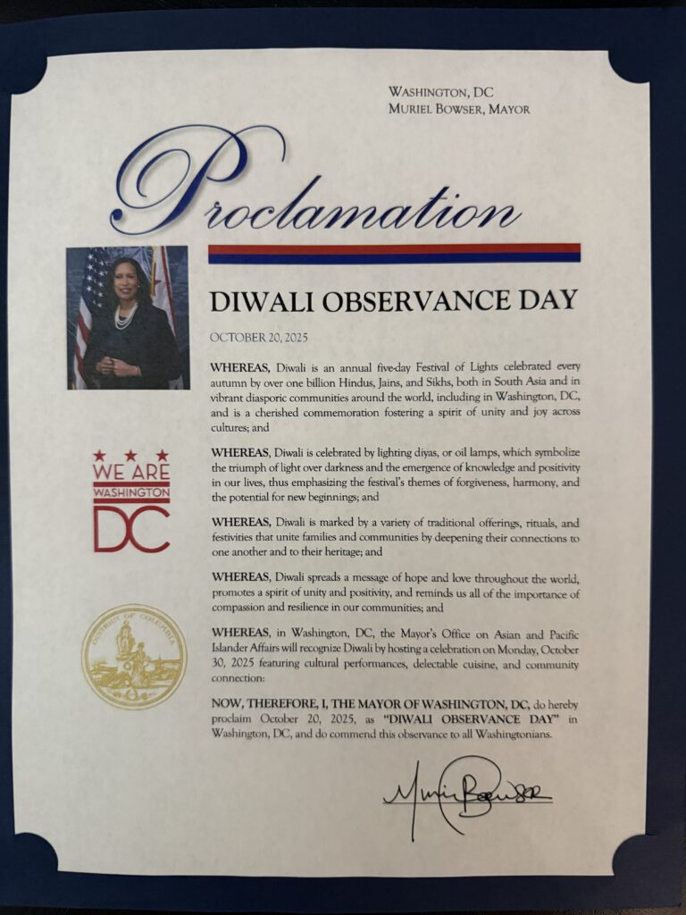 To commemorate the occasion, Mayor Bowser issued an official proclamation recognizing Diwali’s significance.