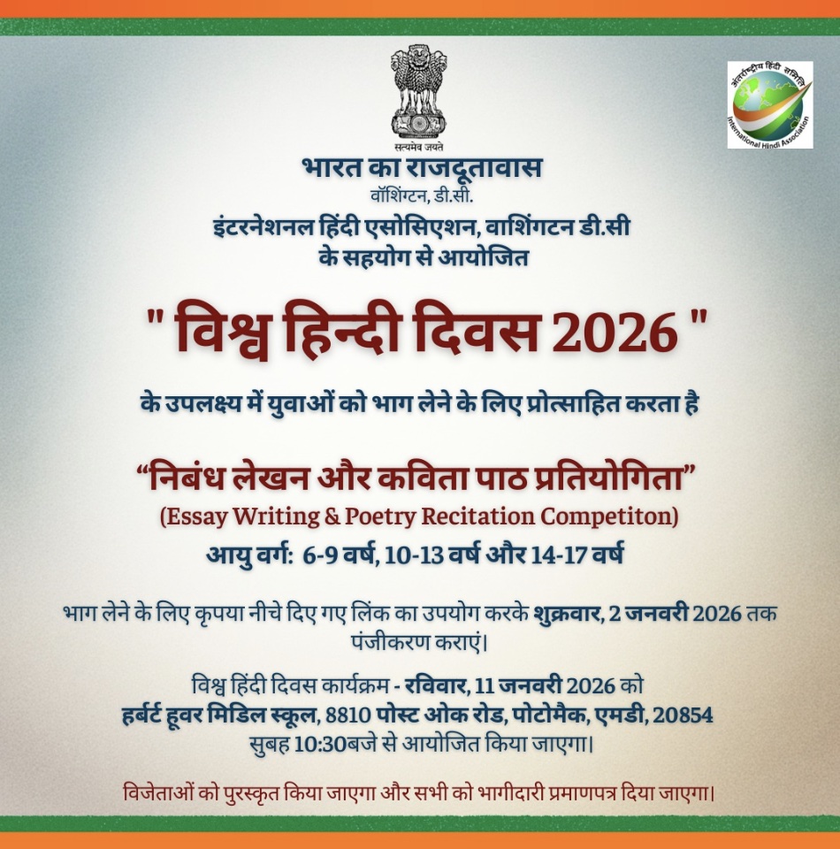 The Embassy of India in Washington DC, in association with the International Hindi Association Washington DC Chapter, will celebrate Vishwa Hindi Divas 2026 on January 11, 2026.