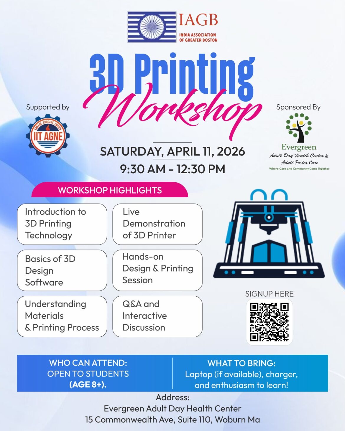 Supported by IIT AGNE and sponsored by Evergreen Adult Day Health Center & Adult Foster Care, IAGB will host a hands‑on 3D Printing Workshop designed to introduce young learners to modern fabrication and digital design, according to a statement.