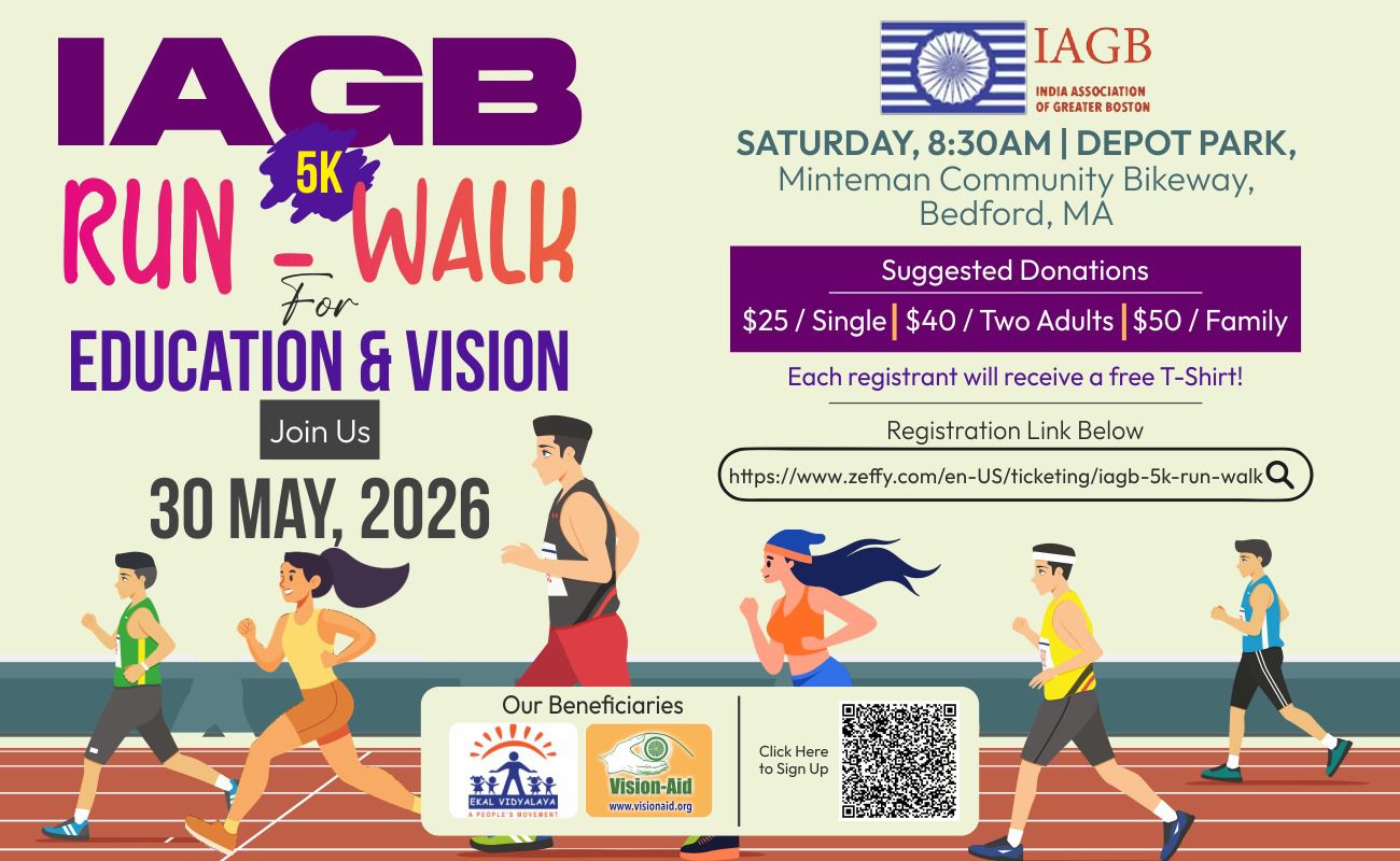 The India Association of Greater Boston (IAGB) will host the IAGB 5K Run Walk for Education & Vision on May 30, 2026, at Depot Park along the Minuteman Community Bikeway in Bedford, Massachusetts.