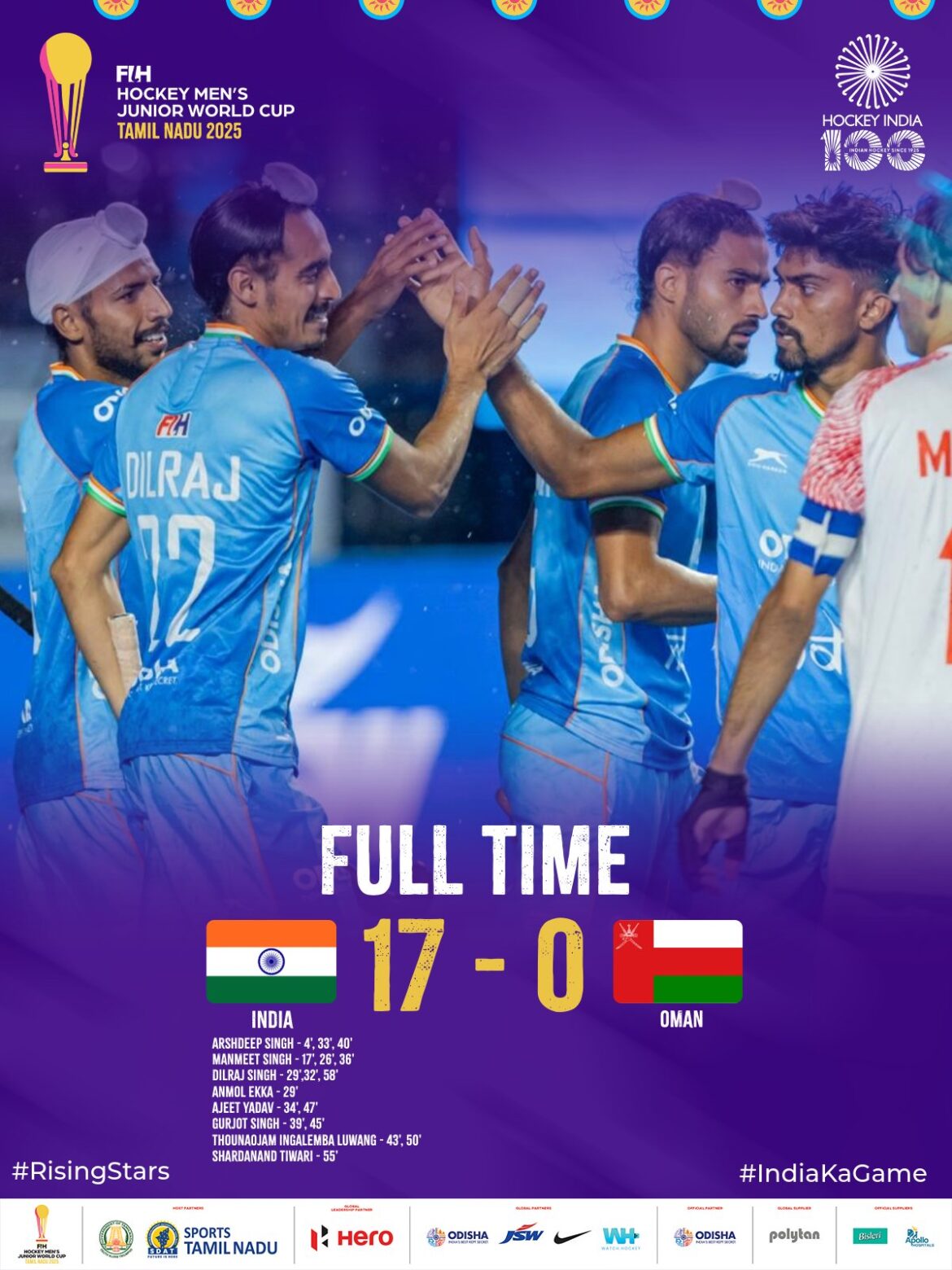 The home crowd at the packed stadium witnessed India’s dominant display against Oman, with eight Indian players finding their names on the scoresheet. Arshdeep scored in the 4th, 33rd and 40th minutes; Manmeet Singh in the 17th, 26th and 36th; Anmol Ekka in the 29th; Dilraj Singh in the 29th, 32nd, 50th and 57th; Ajeet Yadav in the 34th and 47th; Luwong Ingalemba in the 43rd; Gurjot Singh in the 39th and 45th; and Sharda Nand Tiwari in the 55th minute.