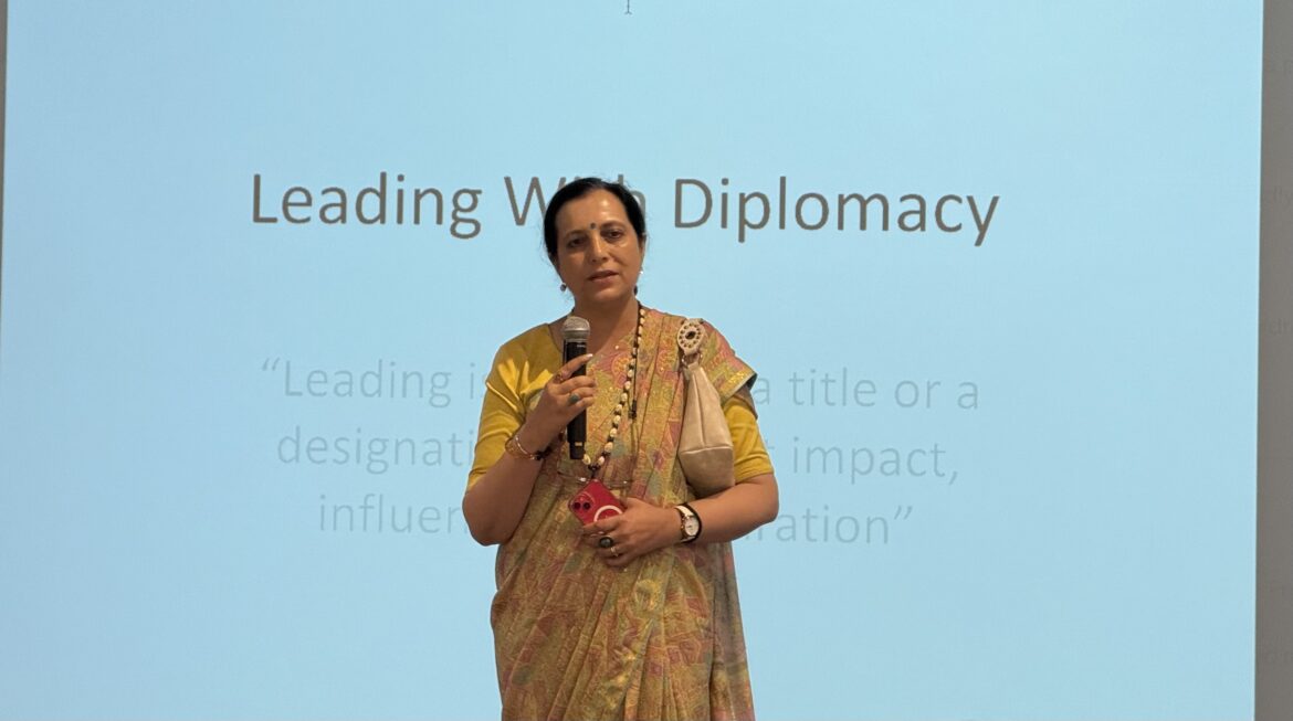 Kwatra, who holds an MBA and an M.Phil. in Finance, shared her personal journey of adaptability – how she transitioned from a career in business to education when her husband was posted to Durban, South Africa in 1994 to establish India’s first Consulate General there. She pursued a two-year bachelor’s in education and became a math teacher. “It’s just because I was determined. I was open minded. I had confidence in myself,” she said, encouraging the youth to cultivate an “open-minded” and resilient mindset.