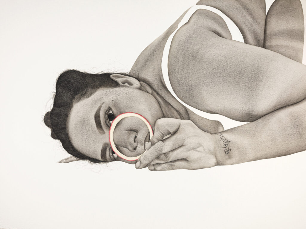 Sachdeva further explains that her artistic process functions as a form of self-examination, engaging with different life stages, including aging and personal transitions such as marriage and divorce, while situating these experiences within a middle-class South Asian context. She notes that turning the lens inward and toward her immediate social environment requires honesty and risk-taking, which often results in a visual rawness. She says she feels empowered when viewers leave her work with a sense of “being seen,” “accepted,” and “confident.”