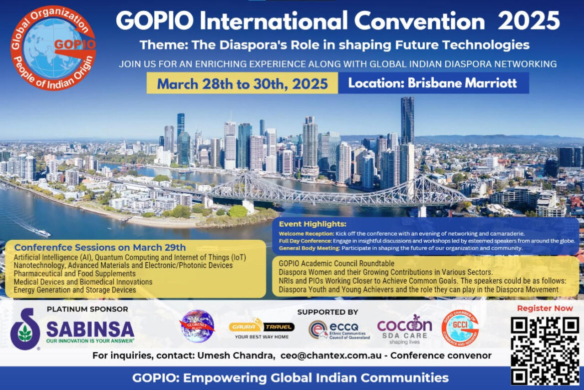 The Global Association of People of Indian Origin, GOPIO, founded in 1989, announced it will be holding its 2025 Convention and Conference in Brisbane, Australia, March 28-30. It also put out the call for names that could be nominated for various awards the organization may announce at the upcoming event scheduled to be held in the Brisbane Marriott. (Brisbane.gopioqueensland.org)