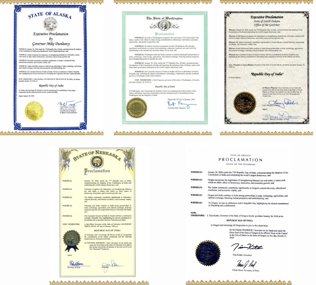 Several states in the US Northwest within the Consulate’s jurisdiction, including Alaska, Nebraska, Washington, Oregon, and South Dakota, also issued proclamations recognizing India’s Republic Day. Governors and other dignitaries from the Pacific Northwest conveyed congratulatory messages.