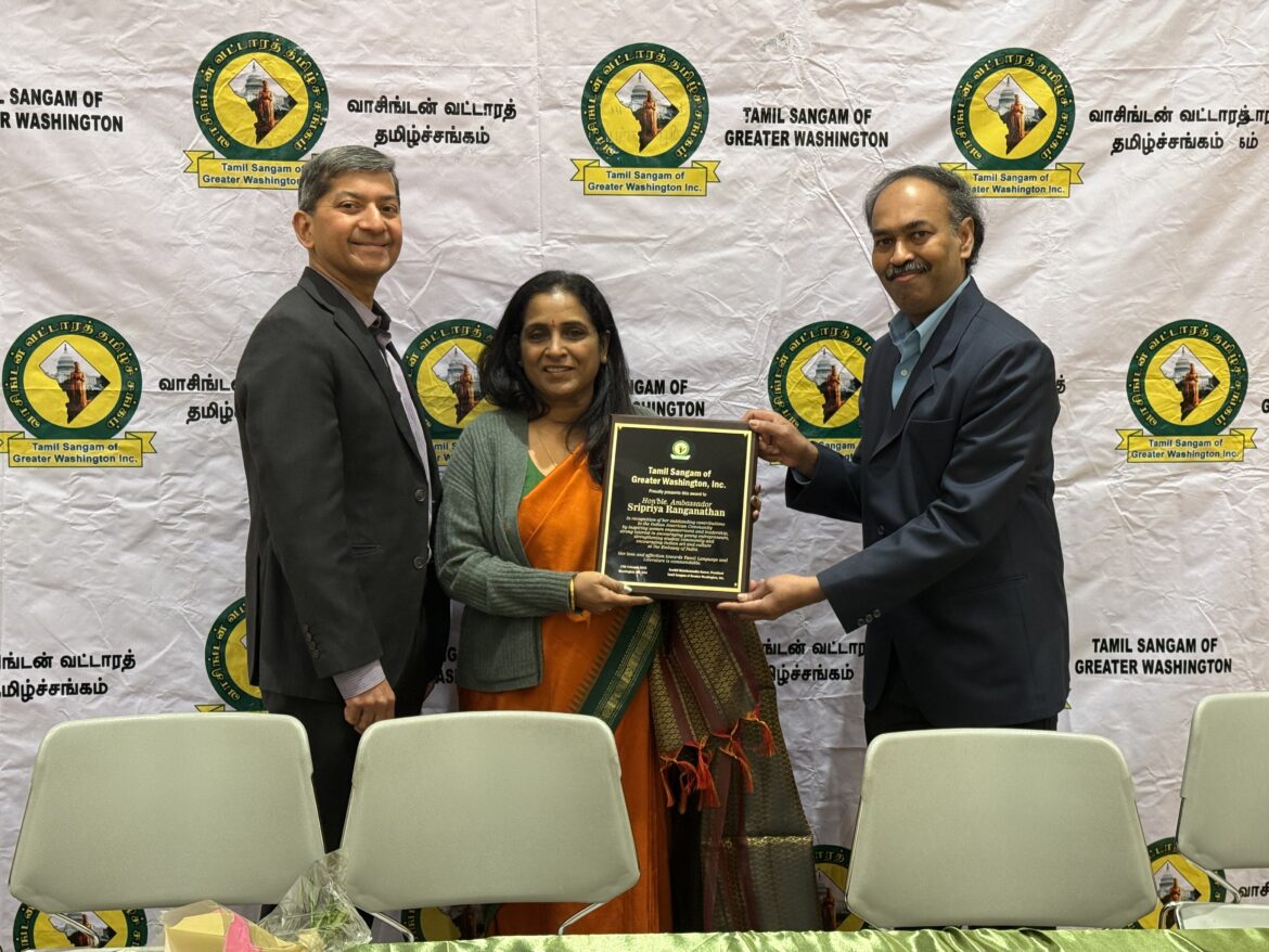 The Tamil Sangam of Greater Washington (TSGW) hosted a farewell reception for Ambassador Ranganathan on February 14, 2025, at the Reston Community Center in Virginia. Speaking at the reception, Ranganathan expressed her admiration for the community’s success. Mukund Santhanam, Ambassador Ranganathan’s husband, also accompanied her at the event.