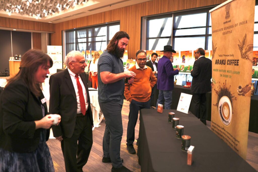 Participants viewing Indian “Araku coffee” on display at Invest India Business Forum 2026 on January 24, 2026, Seattle. PHOTO: CGI Seattle