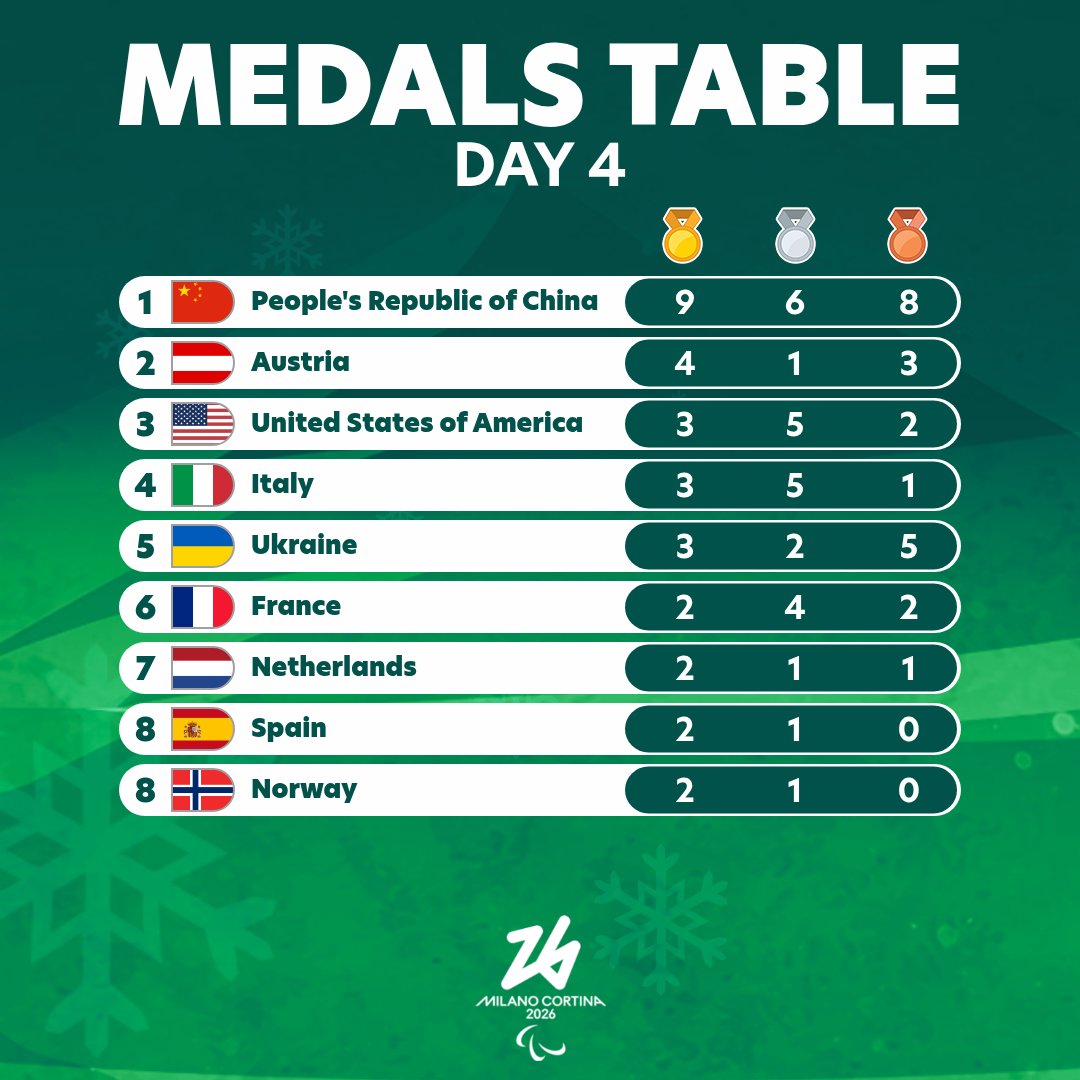 On the fourth day of competition at the Milano Cortina 2026 Paralympic Games, Italy recorded a historic milestone in para ice hockey, while new medals were awarded in alpine skiing and cross-country skiing. American athlete Oksana Masters secured her second gold medal of the Games, and Belarus celebrated the first Paralympic title in its history.