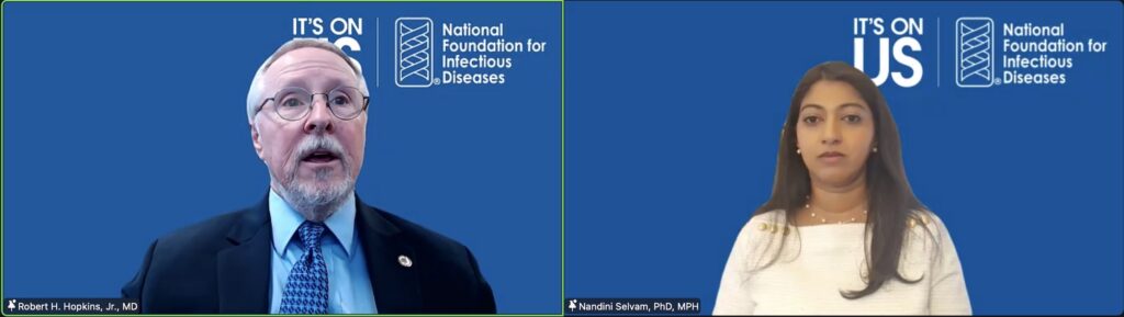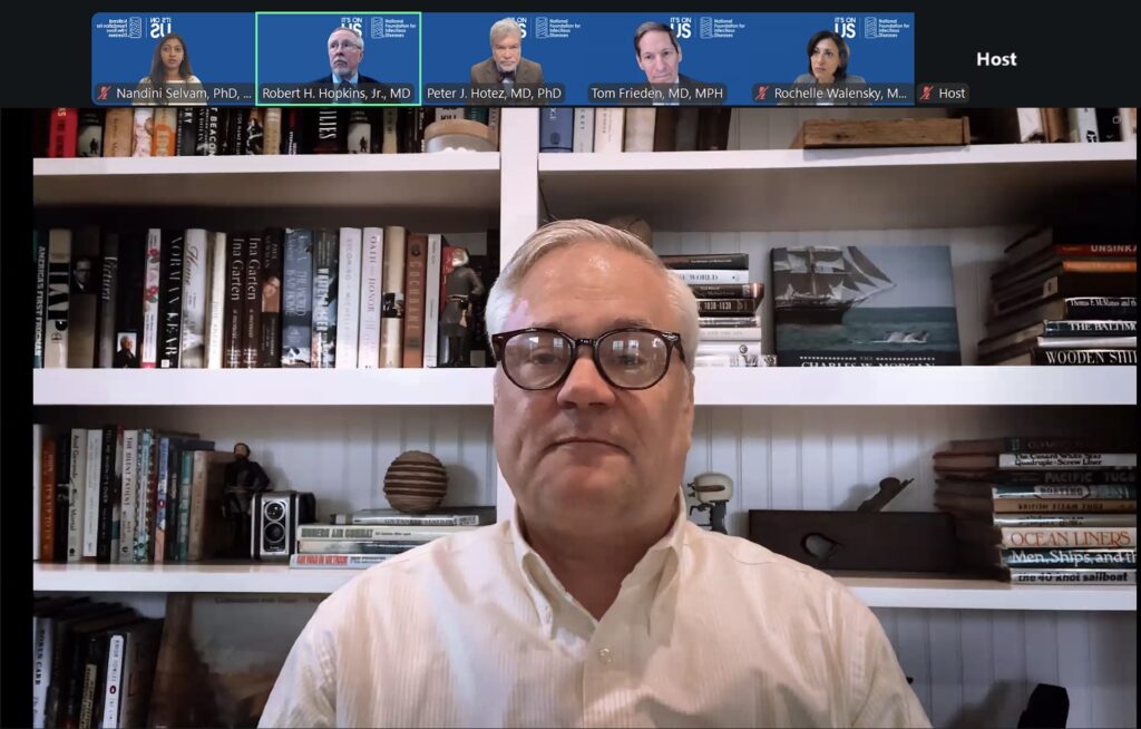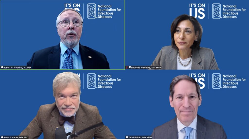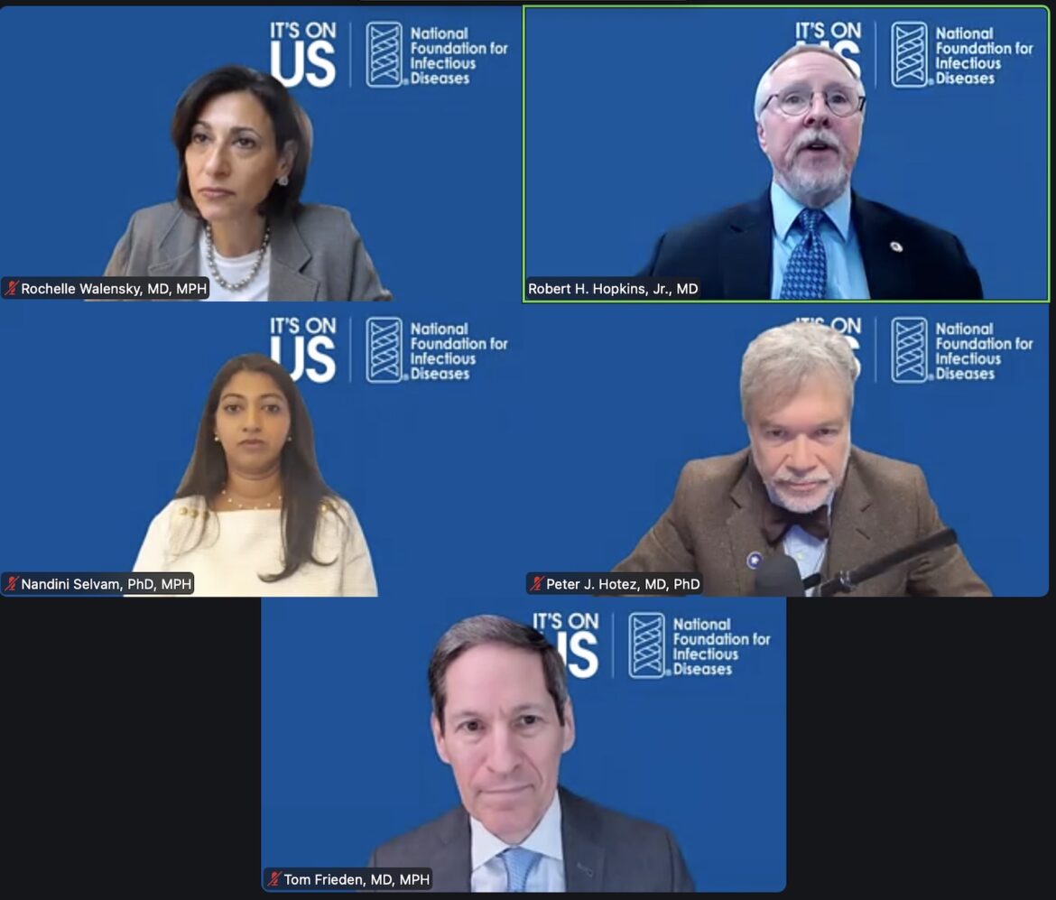 The briefing was moderated by Robert H. Hopkins, Jr., MD, NFID medical director. Panelists included Rochelle Walensky, MD, MPH, former CDC director and professor at Harvard Medical School; Peter J. Hotez, MD, PhD., dean of the National School of Tropical Medicine at Baylor College of Medicine; and Tom Frieden, MD, MPH, former CDC director and founder and CEO of Resolve to Save Lives.