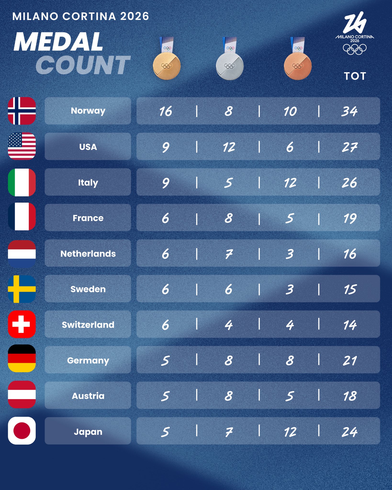 Norway maintained its lead with 16 gold medals and 34 overall medals. The United States now has 27 total medals, followed closely by Italy with 26. Canada remains in 11th place with 15 medals, including four gold.